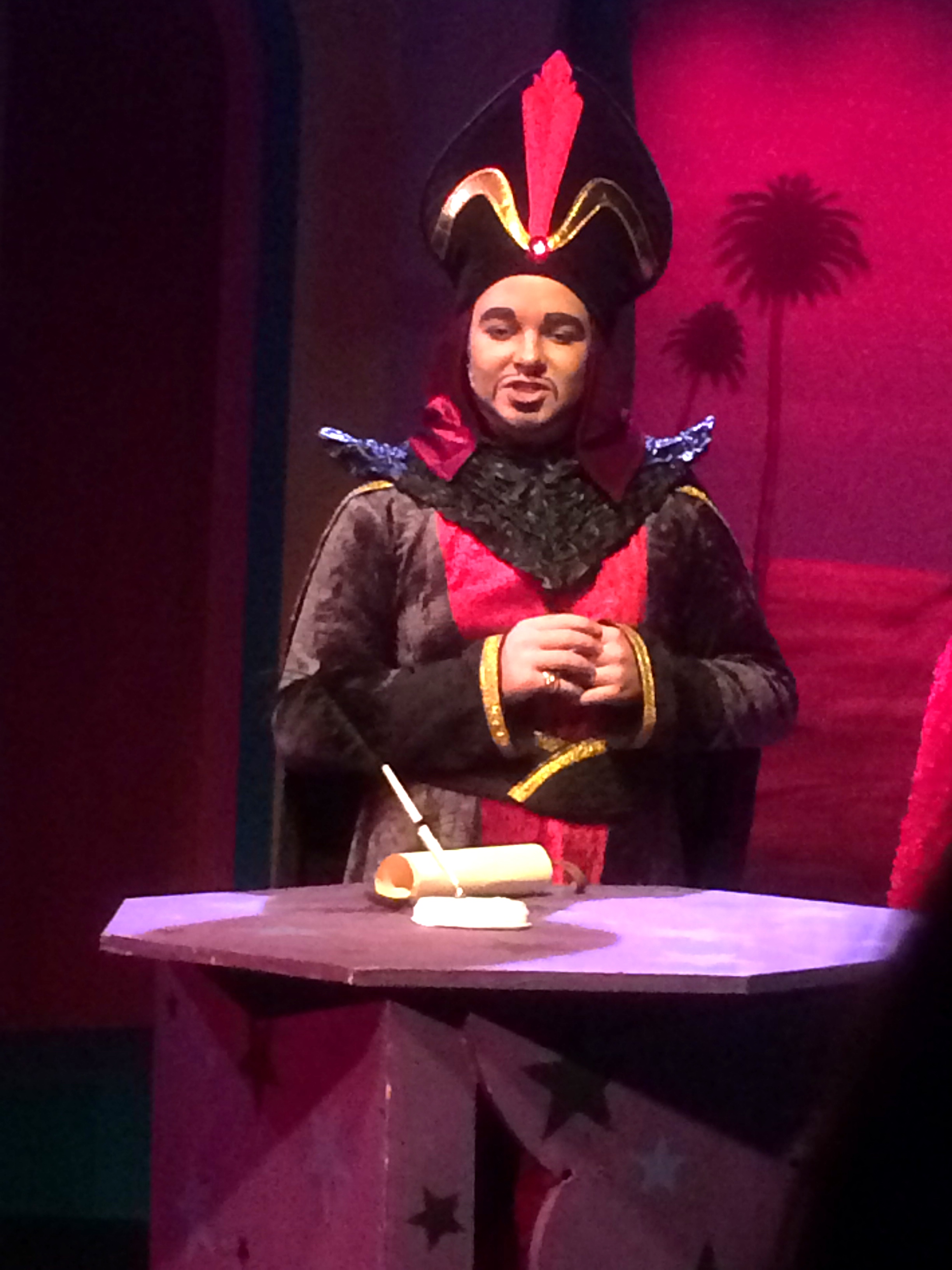 Besides the main lead roles, there were some standout performances from the other cast members. The dynamic duo award from me goes to the Genie, played by Mariah Tobin, and the Magic Carpet played by Allison Zatlin. They are the heroes that never made it to Super status, but seem content to be as helpful as they can, and always with a smile on their faces. Tobin has a big stage presence and her character is all about the show part of the show. Her part is funny and she does the comedy well. Without any actual lines in the play, Zatlin, as the Magic Carpet, says everything she needs to say with an enthusiastic combination of facial expressions, body language, acrobatics, and effervescent charm. Without a word, we know what she was saying. Another standout is the evil Jafar (Kyle Warner). Warner plays a bombastic, yet ultimately dopey, villain with a propensity for self adulation and a gift for interpretive dance. If he did Shakespeare, he could be a great Prince of Aragon. There are few things funnier than a big villain doing soft-shoe, and Warner nails it.