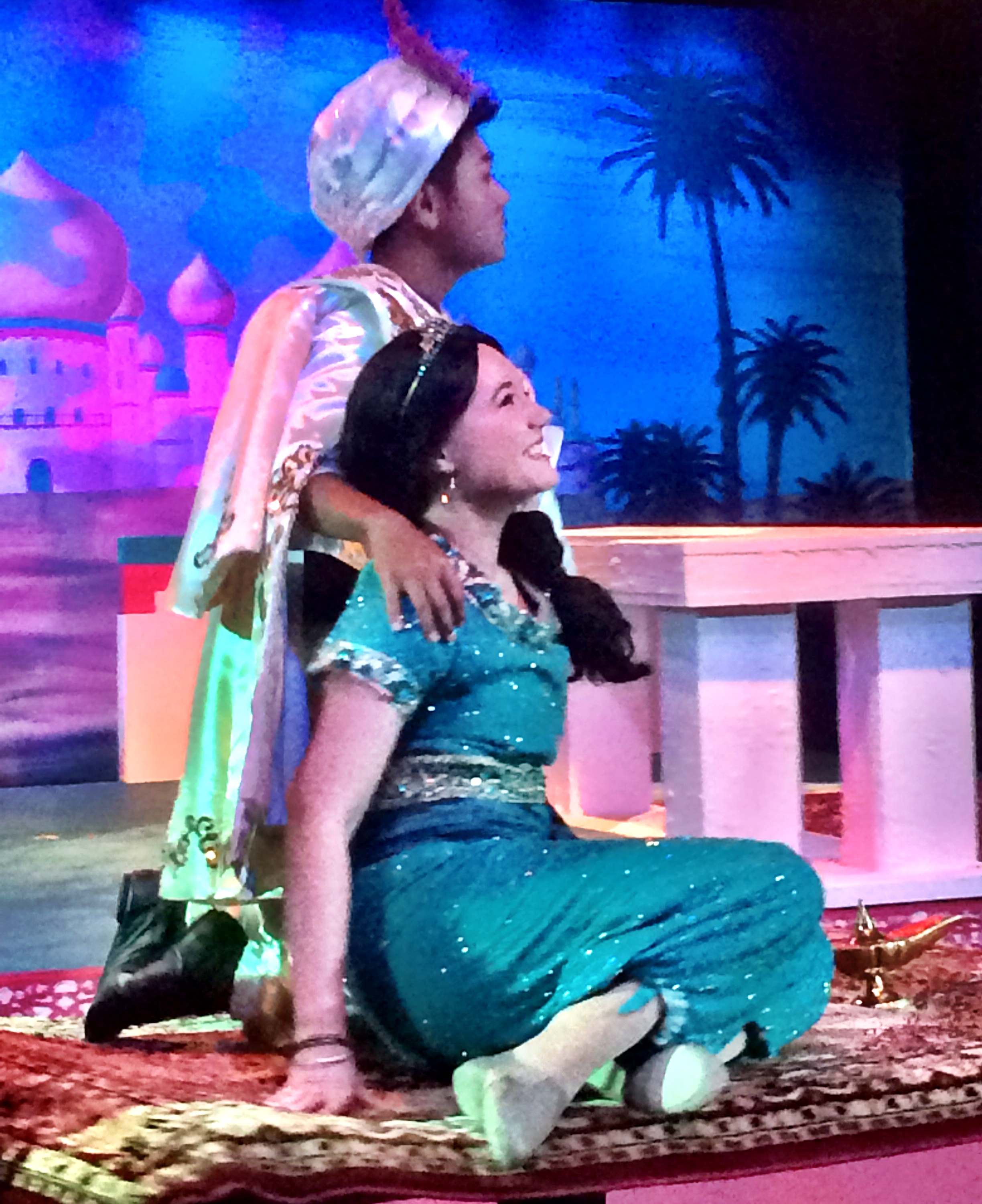 “Welcome to Agrabah”…a group of young performers in Arabic garb welcomes you to the fictional Arabian city as you enter the Hillcrest Center for the Arts in Thousand Oaks. Once in the theater, you are transported to a market square outside the palace of the Sultan where Aladdin begins his adventures with petty crime, magic lamps, flying carpets, evil schemers, and a lovely princess. With the help of a well-caffeinated genie he learns the pitfalls of dishonesty, the value of being himself, and how to win the heart of a princess.