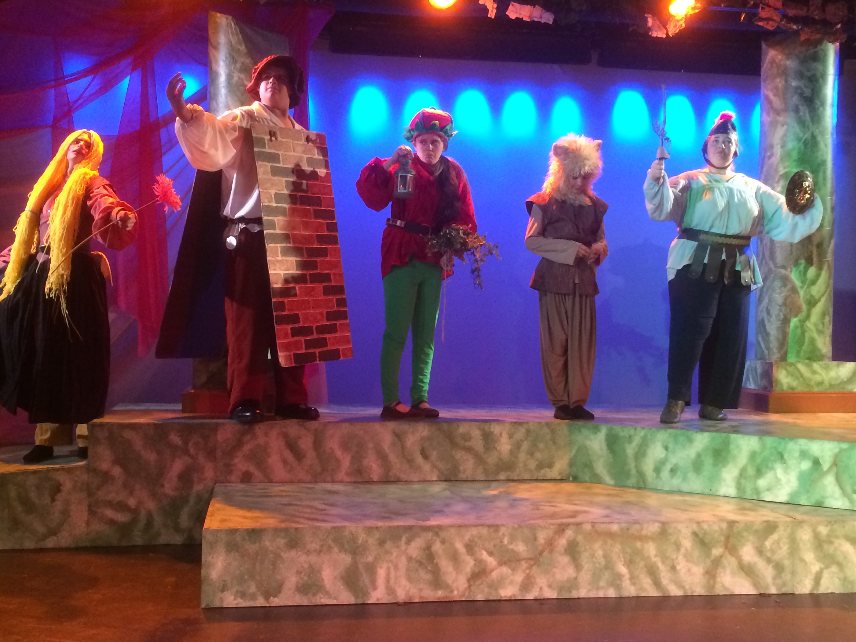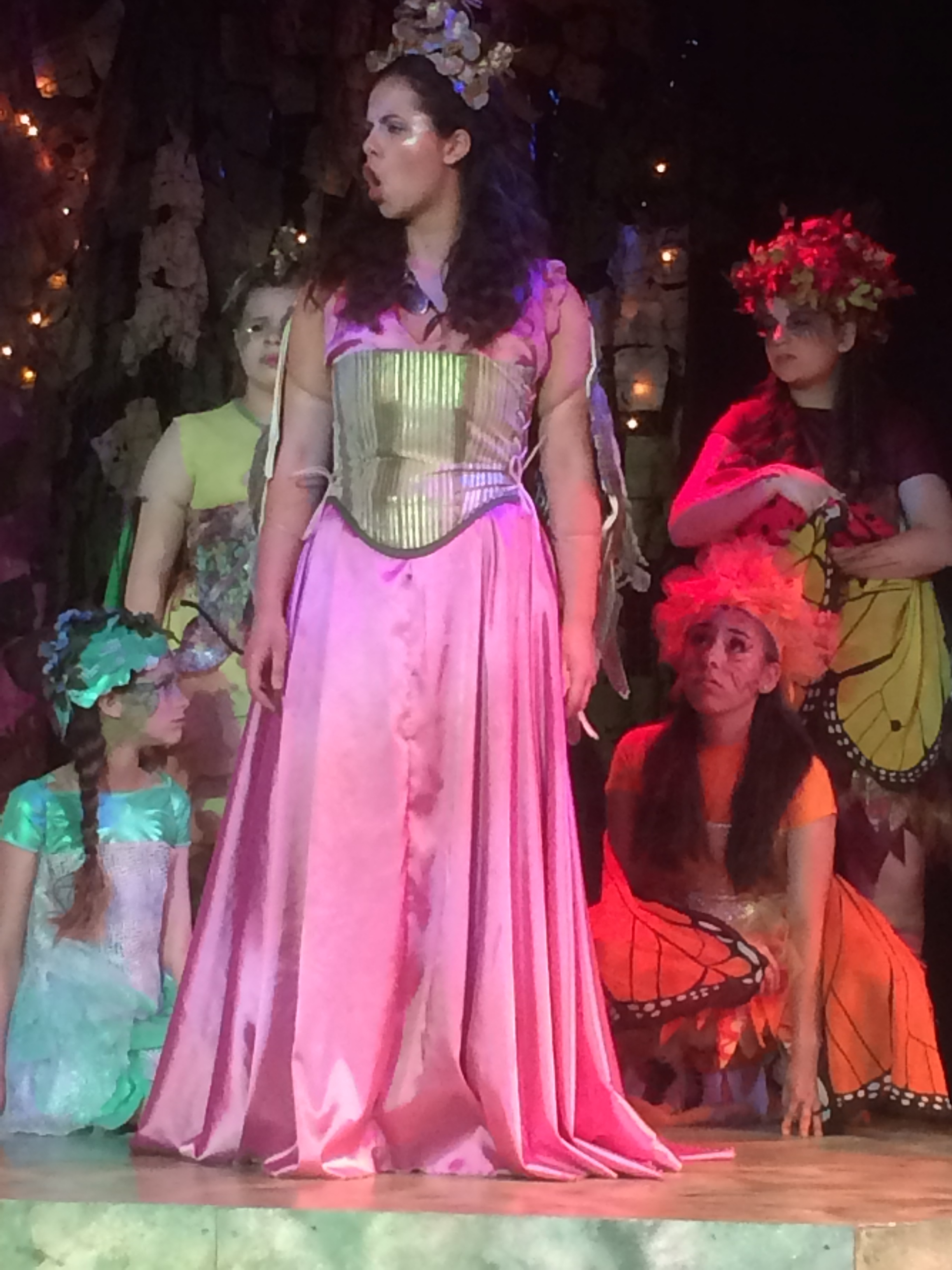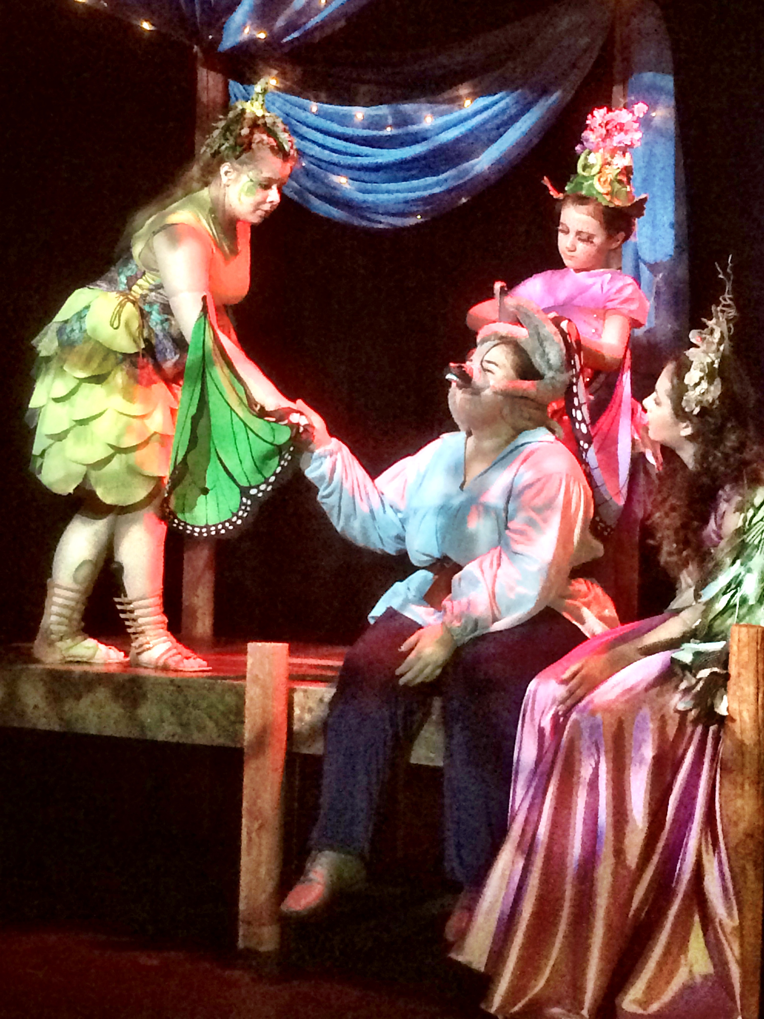 A few other notes of praise are due to the production department. First, the costuming is fantastic (Bianca Jansen), particularly with the fairies. Each had a different look and it helped set them apart. The lighting department (Mark Andrew Reyes / Micah Meyers) deserves mention for how the scenes were set. In particular, the scenes in the fairy world were so well done with the lighting. It really transformed the scenes. I also loved the sound effects, which were done by the cast of fairies using a makeshift assortment of noisemakers. They brought much drama and light to much of the play. Finally, recognition is due to Director Megan McDonough. It takes a lot of confidence in your cast to bring Shakespeare to youth theater. Your confidence was rewarded with a fantastic performance.