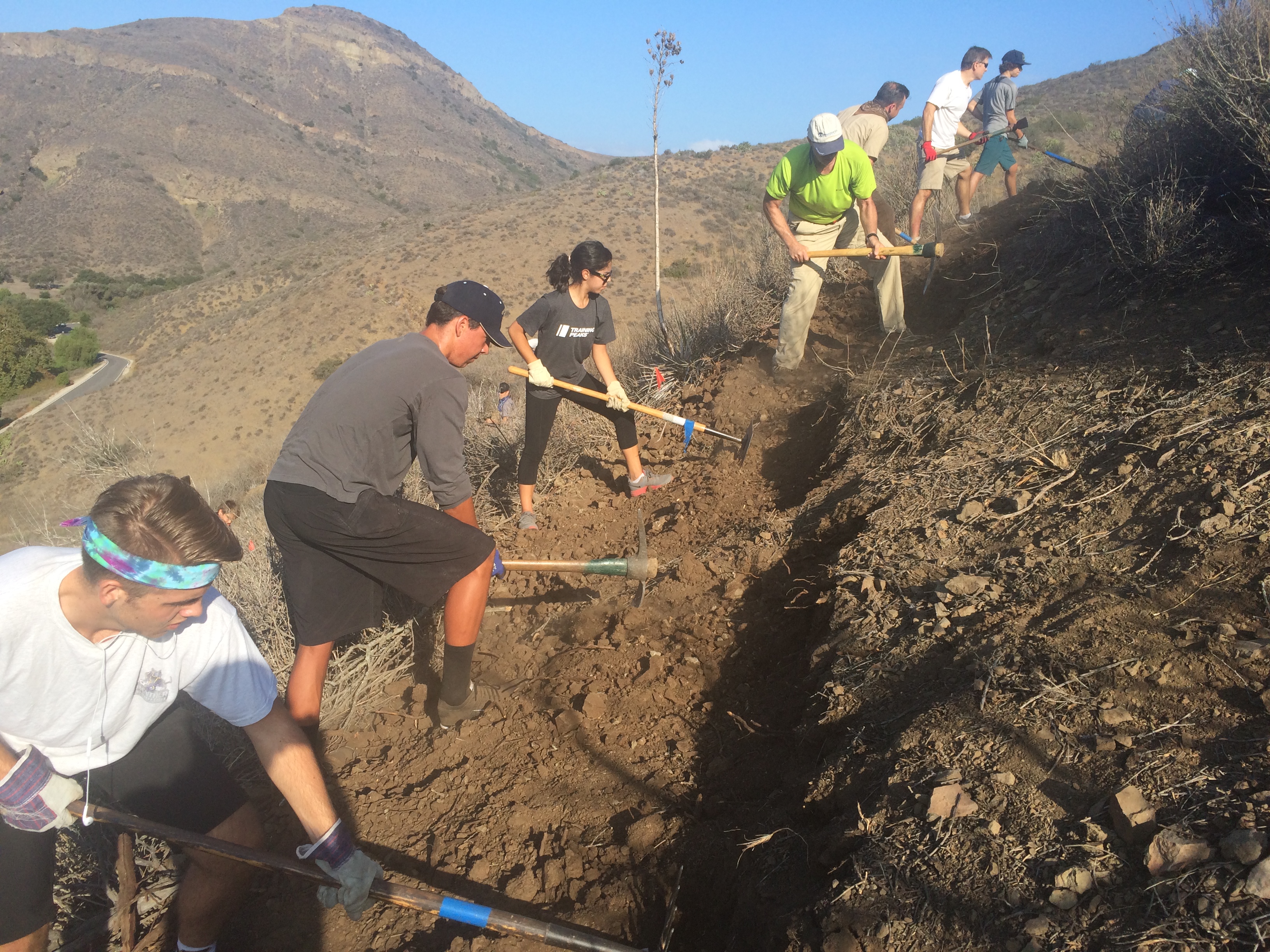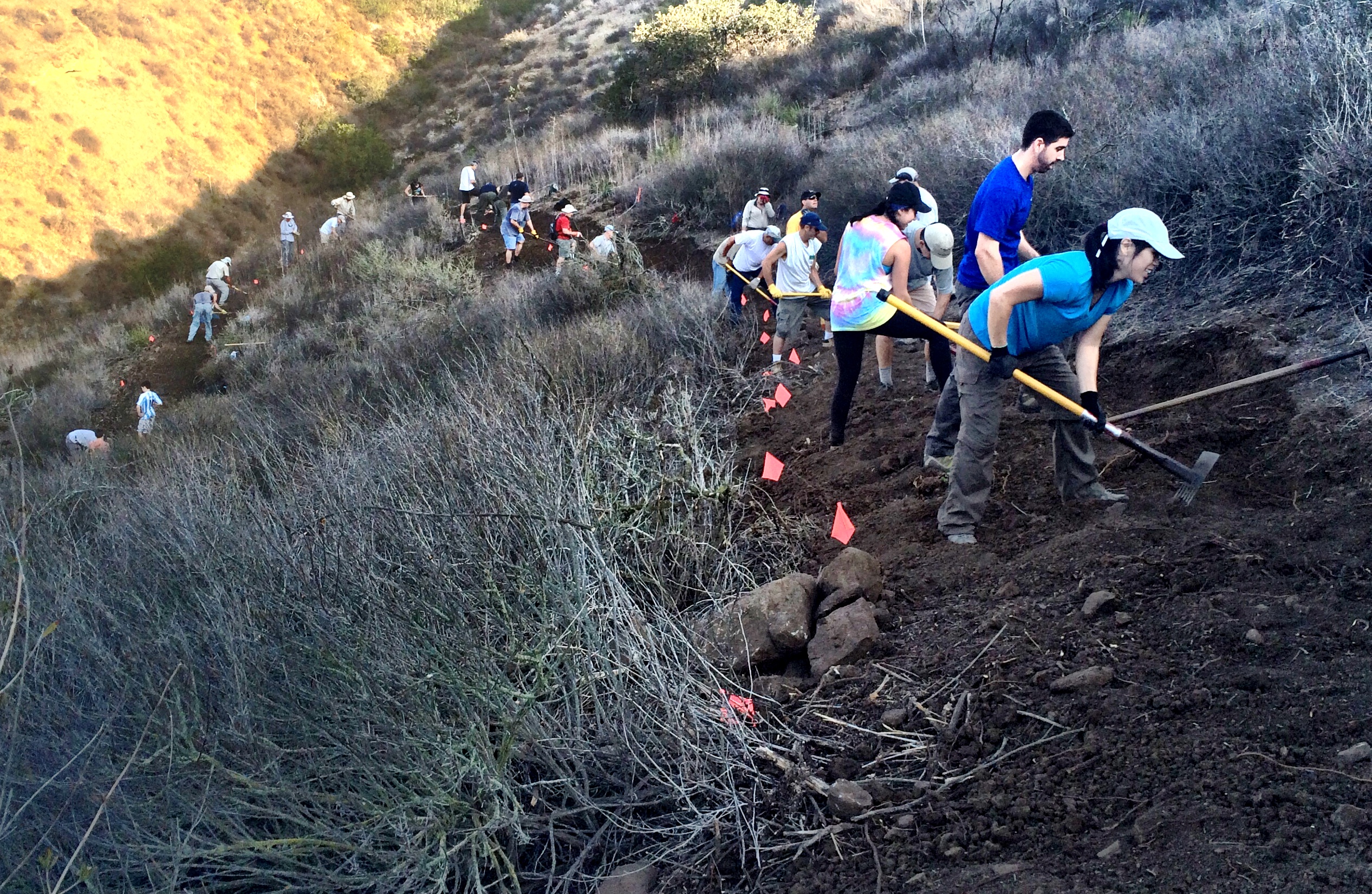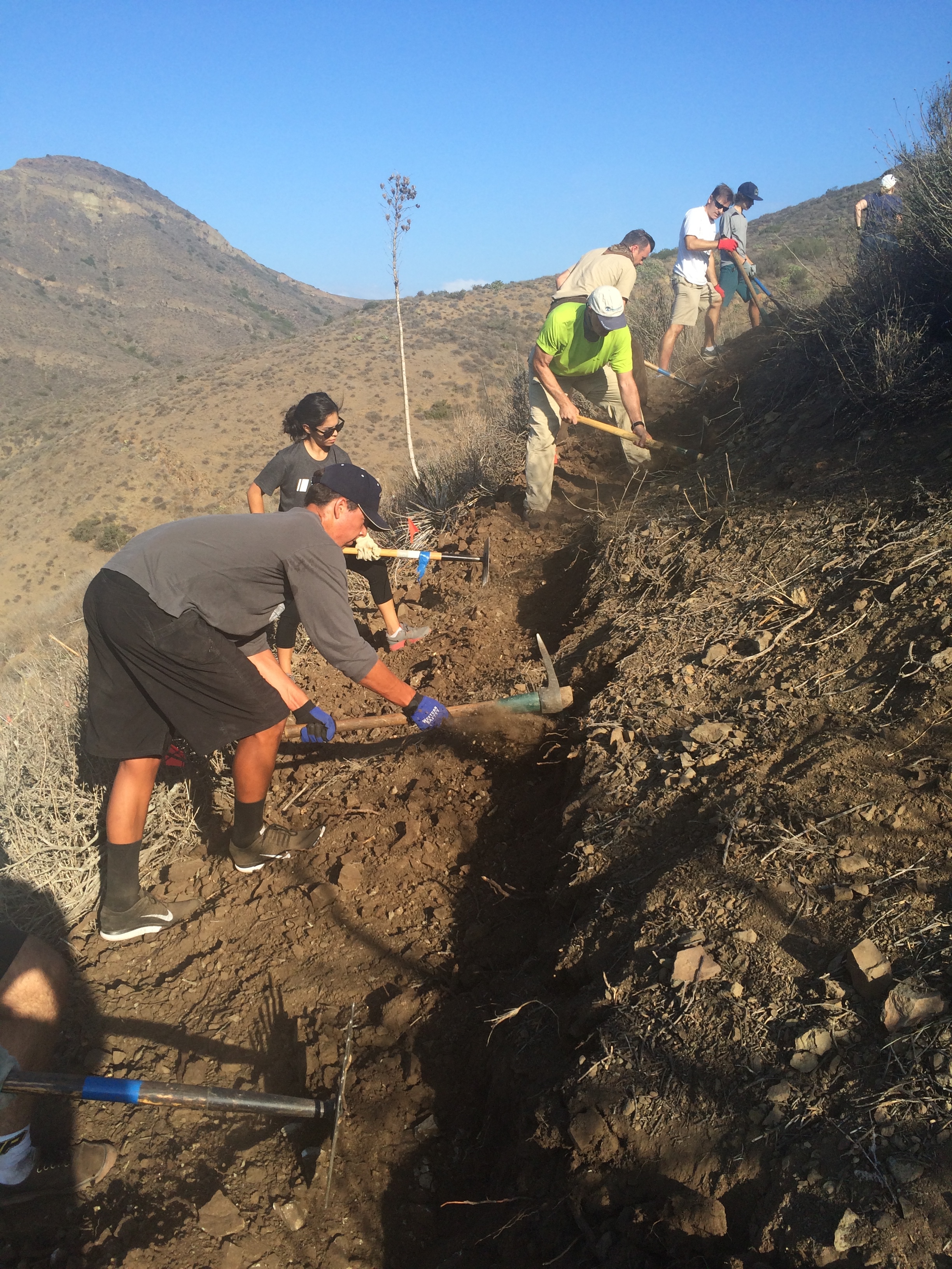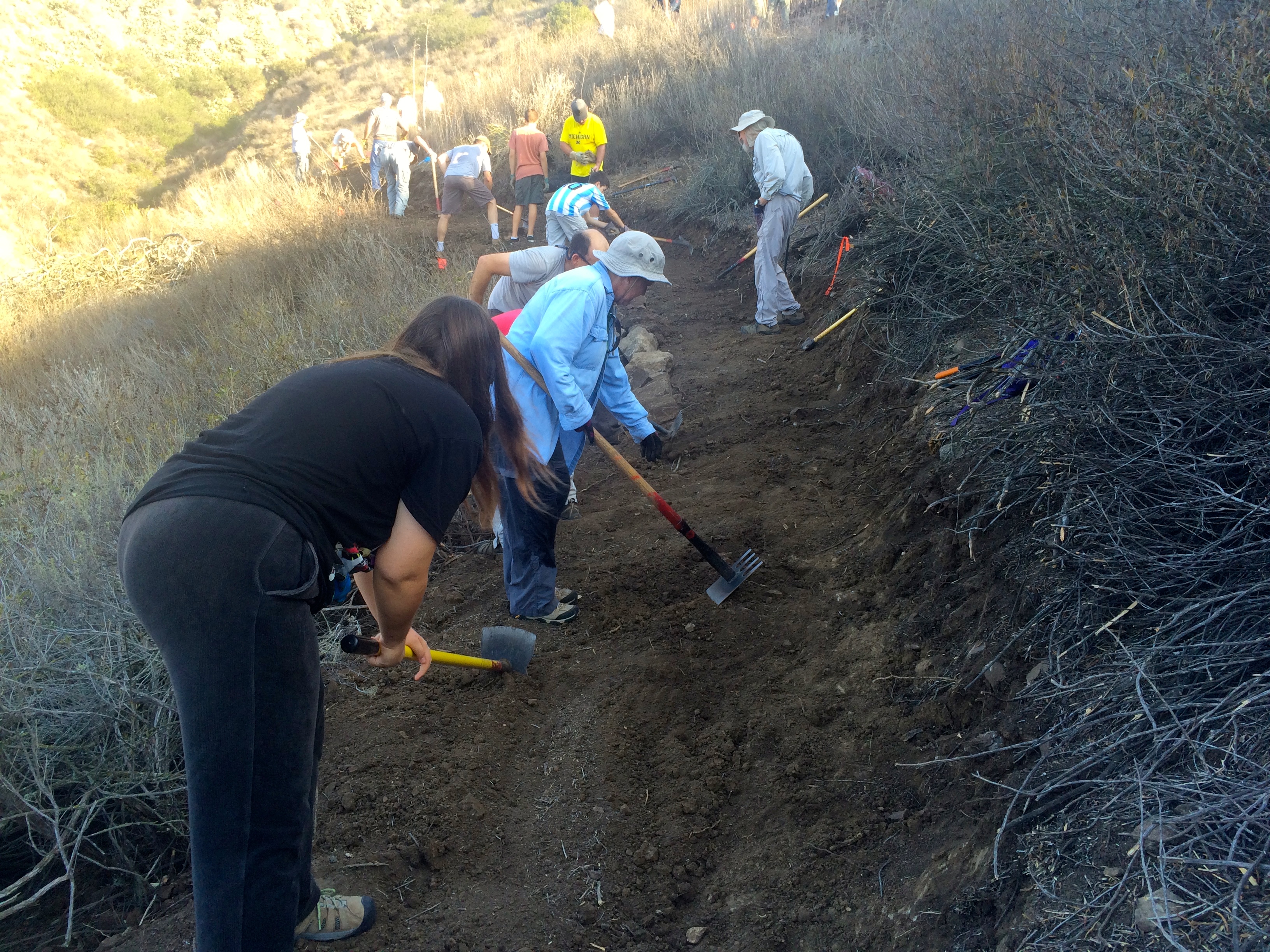 The crowd was separated into teams of ten or so and deployed to marked areas on the trail. The trail route had already been “brushed” (shrubs cleared) and the volunteers were creating the new tread. A contingent of trail construction experts affiliated with the Concerned Off-Road Bicyclists Association (CORBA) were on hand, along with rangers and COSTAC members to make sure the trails were being properly constructed. Volunteers were of all ages and a number of families came as a group to help out, and there was a great sense of camaraderie among all participants. This is what we at Chillin in the Conejo call “Conejo Spirit!”.